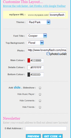 ...se avete uno spazio in MySpace e vi piacciono i siti in flash, vi conviene andare in LoveMyFlash, mentre se volete una template in html andate su ProfileMine, comunque in etrambi i siti troverete sicuramente un template di vostro gradimento!! ;)