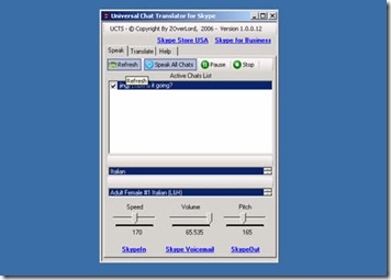 Speak and Translate Chats è un plug-in che legge e traduce le chat di Skype. Il traduttore on-line di cui si avvale non è perfetto (come del resto non può esserlo alcun traduttore automatico) ma rappresenta un solido aiuto per instaurare una conversazione efficace in una lingua poco conosciuta. Gli usi sono vari. Dalla lettura automatica dei messaggi anche quando non si è davanti allo schermo, all'assistenza nell'apprendimento di altre lingue attraverso la combinazione di lettore e traduttore. A suo modo è anche uno strumento accessibile per persone con deficit visivi.